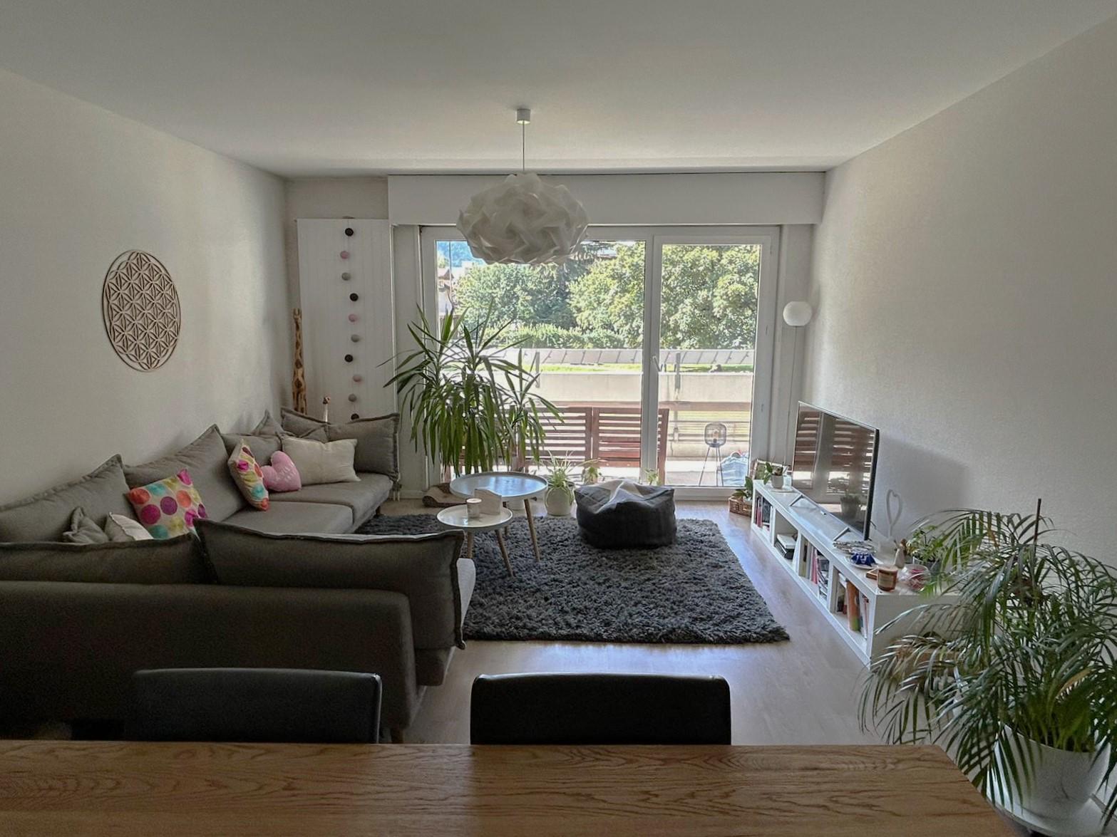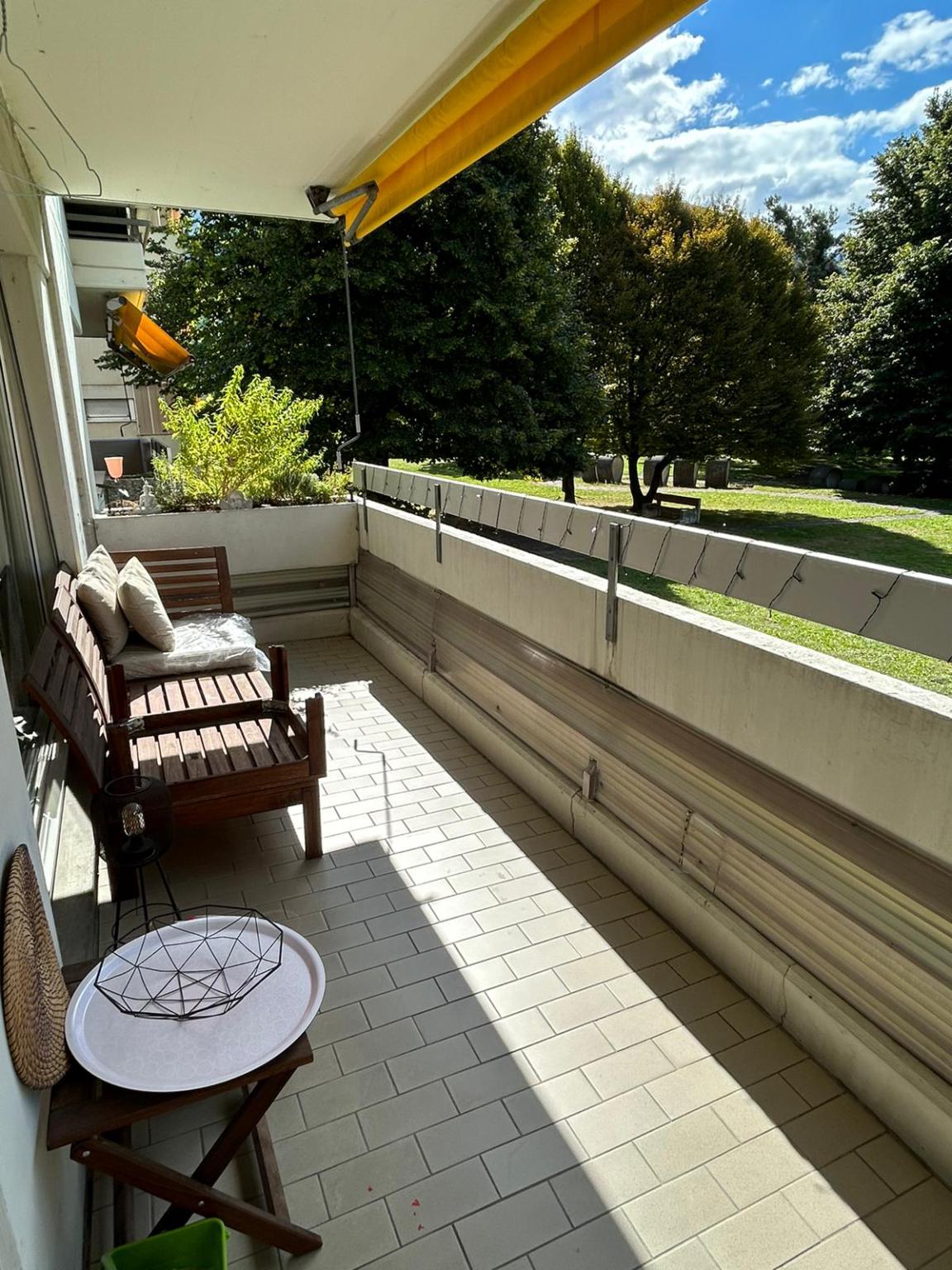 Dank der Südwest-Ausrichtung profitiert das Wohnzimmer den ganzen Tag über von viel Sonnenlicht. Der überdachte Balkon bietet einen komfortablen Aussenbereich ohne direkte Einsicht mit Blick auf die Gartenanlage der Liegenschaft.