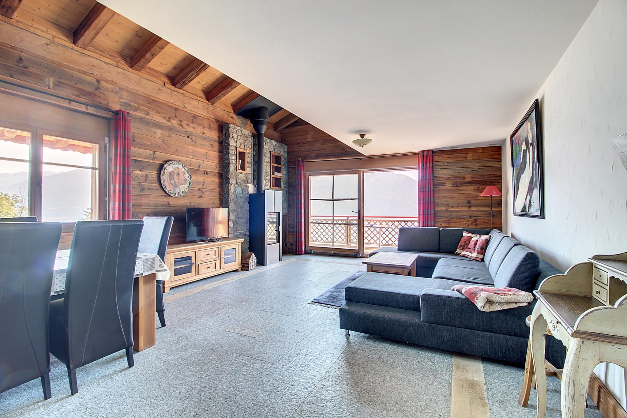 - Bright living room with wood-burning stove and access to the balcony-terrace